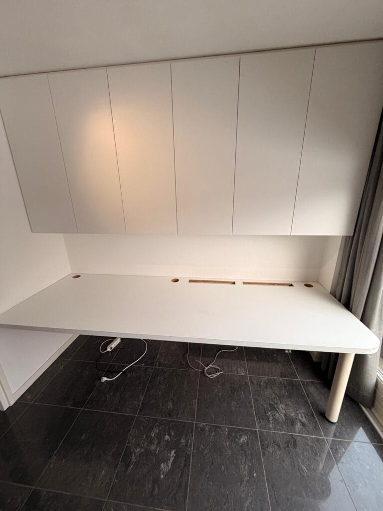 Hieronder zie je het verschil vóór en na het wrappen. Door gebruik te maken van hoogwaardige interieurfolie krijgt het oppervlak een compleet nieuwe uitstraling, zonder hak- of breekwerk.